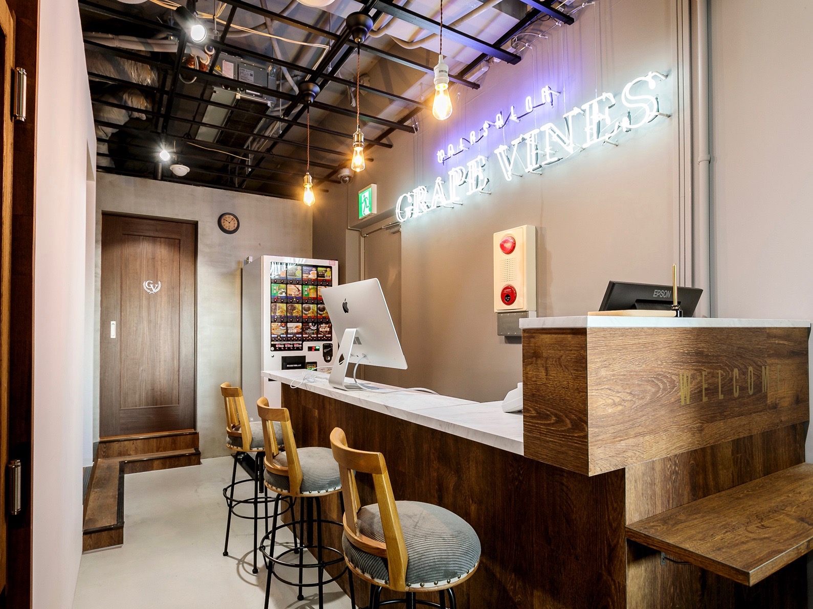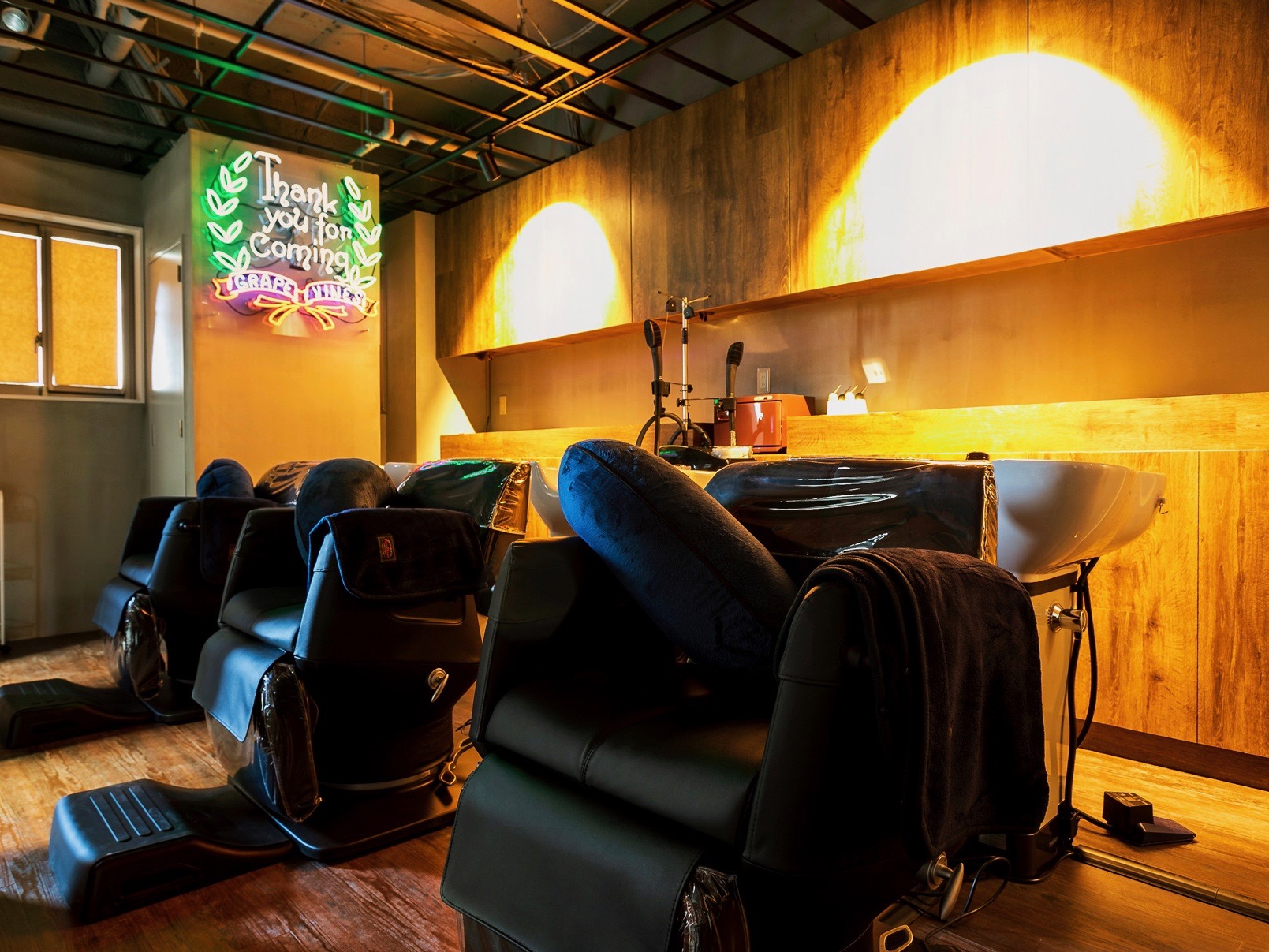 また二部屋を1部屋にも出来、着付けなど広いスペースの必要な個室にも対応しています。待合はカフェカウンターっぽくデザインし、ネオンサインや照明を際立たせる落ち着いた色合いで統一してます。